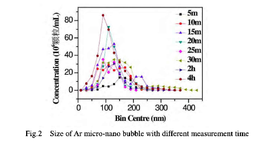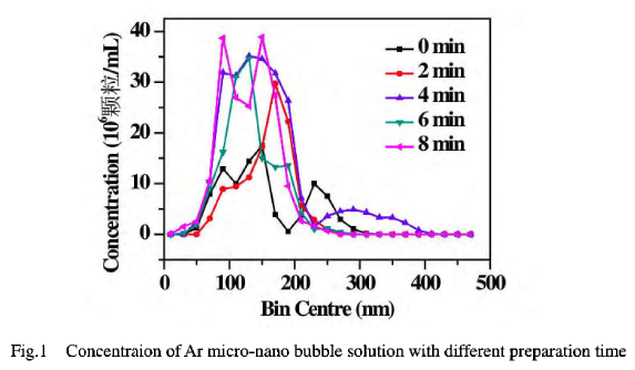 本文使用微纳气泡发生装置对二次蒸馏水进行增气处理后产生富含某种气体的微纳气泡水溶液。从定量角度研究微纳米气泡的大小和浓度, 使用Nanosight纳米颗粒分析仪进行监测。以微纳氢泡为例, 经检测, 微纳氢泡大小主要集中在150nm左右, 且随着通入气体时间的延长, 气泡浓度增加, 大约在106一l07颗粒/mL。当通入量至第4min时,变化不大,说明溶液己达到最大饱和度了。此外, 还发现对于通入相同氢气的样品, 随着时间推移, 其平均粒径在变小, 单位体积颗粒数增加。其它微纳米气泡的性质与微纳氢泡类似。