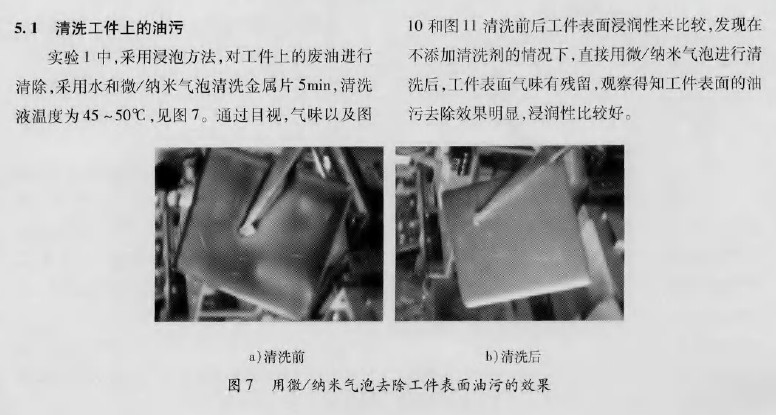 1)在清洗液水温45~50% ,浸泡时问为5min的实验条件下,微/纳米气泡清洗方法对于含废油和切削油工件,不需要配合其他脱脂工艺,仅通过浸泡方式就起到明显的脱脂效果;