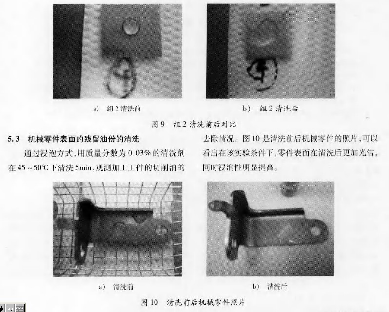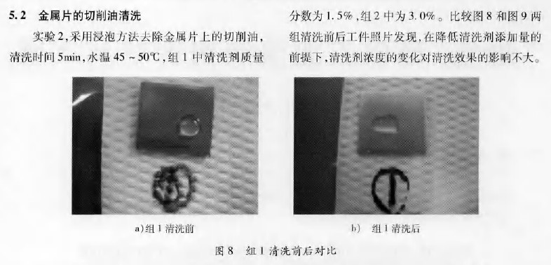 在采用常规的清洗方法进行金属表面脱脂时,规定的清洗剂质量分数为6.0% ,而在本实验中,分别在不添加清洗剂,清洗剂质量分数为规定量1/2、1/4、1/20的条件下,对三类工件进行了脱脂实验操作。通过目视、气味、浸润性的比较结果表明: