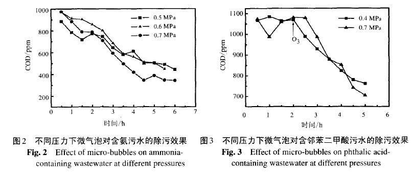综上所述,在除氨污水实验中,压力越高,其污水的COD值下降越快,被除去的氨气也就越多。而 含邻苯二甲酸水样的实验中,压力变化对去除邻苯 甲酸的影响不是很明显,可见邻苯二甲酸是很难除去的一种污染环境的物质,后期通入臭氧后,由于微气泡的作用,也可以降低邻苯_二甲酸含量。