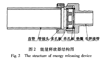 在与自吸泵叶轮轴心相对的泵外壳加工安装一进气阀(转子流量计用来控制进气量),利用叶轮在吸、排水过程中,叶轮输入口处产生的负压自动吸气,使得自吸泵在工作过程中,持续吸入水与空气,形成气水混合物,在叶轮的高速搅拌下,充分混合,增加氧气与水的接触。能量释放器结构如图2所示,当混合物到达能量释放器时,气水混合物从能量释放器的单孔板中心孔进入单孔板与多孔板之间,由于两板间隙很小,导致压力剧增,并压流四周至多孔板周边环形槽;由于容积扩大,压力突降,承受高压的气泡此时爆破,形成无数微小气泡,其直径在微米级,大大增加了氧气与水的接触面积,而且在水中停留时间相对较长,所以对氧气的吸收率大大提高。