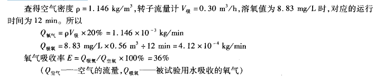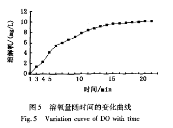 由图5可知:饱和溶氧浓度的10%所对应的时间t 1=2.2min,对应的溶氧浓度C1=0.88mg/L;饱和溶氧浓度的75%所对应的时间t2=8.1 min,对应的容氧浓度C2=6.62mg/L。