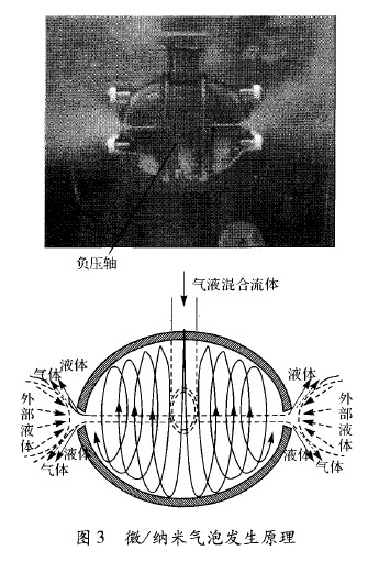 旋回式气一液混合型微/纳米气泡发生技术是国际发明专利技术,目前已申请中国、日本、韩国、欧洲、美国的专利保护,并均已授权。该技术是按照流体力学计算为依据进行结构设计的发生器(图2),在进入发生器的气一液混合流体在压力作用下高速旋转(图3),并在发生器的中部形成负压轴,利用负压轴的吸力可将液体中混合的气体或者外部接人的气体集中到负压轴上,当高速旋转的液体和气体在适当的压力下从特别设计的喷射口喷出时,由于喷口处混合气液的超高的旋转速度与气一液密度比(1:1 000)的力学上的相乘效果,在气一液接触界面间产生高速、强力的剪切及高频率的压力变动,形成人造极端条件。在这种条件下生成大量微米、纳米级气泡的同时,具有打碎聚合分子团,形成小分子团活性水的效果,并能够将小部分水分子电离分解,可以在微/纳米气泡空问中产生活性氧、氧离子、氢离子和氢氧离子等自由基离子,尤其氢氧自由基有超高的还原电位,具有超强氧化效果可以分解水中正常条件下也难以分解的污染物,实现水质的净化。微/纳米气泡在水中的溶解率超过85% ,溶解氧浓度可以达到l0mg/L以上,并且微/纳米气泡是以气泡的方式长时间(上升速度3m/h)存留在水中,可以随着溶解氧的消耗不断地向水中补充活性氧,为处理污水的微生物提供了充足的活性氧、强氧化性离子团,并保证了活性氧充足的反应时间,由微/纳米气泡处理过的水的净化能力远远高于自然条件下的自净能力。