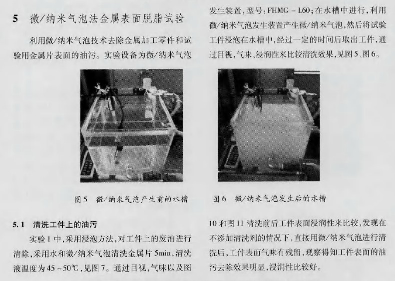微/纳米气泡具有比表面积大、在水中停留时间长、自我加压、溶解消失等特点,富含微/纳米气泡的水作为清洗剂应用于清洗行业,在达到清洗目的的同时,清洗剂本身几乎不需要添加其他助剂,环保、可回收。本文在实验室条件下,利用微/纳米气泡对金属工件进行的脱脂实验,初步验证了微/纳米气泡技术在清洗行业中应用的可行性及优越性。可以预见,这种节能、节水、环境友好的新型清洗技术如果在清洗工程上成功应用及推广,将会大幅度的降低清洗行业的施工成本,减少环境污染。